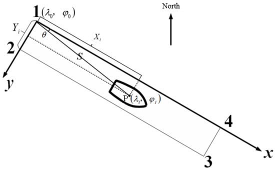The conversion of latitude and longitude coordinates is required after establishing a right-angle coordinate system for the channel. As shown in Figure 8, point 1 is selected as the reference point for coordinate conversion, and its latitude and longitude are (31.373 °N, 121.612 °E), noted as . Point P is the vessel’s real-time position in the channel, and its latitude and longitude are noted as . From the Mercator Navigation Method [25], the vessel’s real-time distance from the origin can be calculated using the vessel’s real-time latitude and longitude. Based on the trigonometric relationship in Figure 8, the longitudinal real-time position of vessel P in the coordinate system can be calculated. The relevant formulae are as follows: