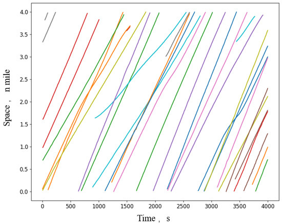To quantify fundamental characteristics of the waterway traffic stream, we need to determine a time–space region. The spatial extent of a single time–space region is the length of the selected channel, and the temporal extent is taken as a time window of one hour. This paper uses the full year 2021 AIS data for the study channel. There are about 8640 time–space regions. As shown in Figure 9, vessels’ trajectories in a time–space region are constructed using data from one time window of the selected voyage as an example. Time is used as a horizontal axis, and the distance traveled by the vessel in the direction is used as a vertical axis. Vessels traveling in the opposite direction may exist in time–space regions, which need to be excluded before calculating fundamental characteristics of the waterway traffic stream. Subsequently, the start and end points of vessels’ trajectories in each time–space region are obtained to determine the travel times and distances. As shown in Table 2, there are data on travel times and distances for all vessels in a certain time–space region.