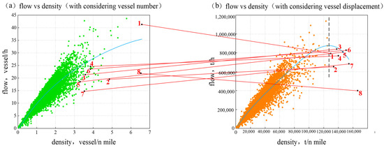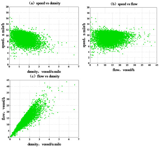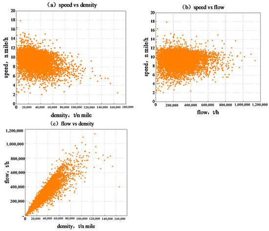 The congested phase of the traffic stream occurs in the flow–density subgraph (Figure 11c) when vessel displacement is the measurement unit. The subgraph can be used to construct a traffic stream model and obtain critical parameters such as optimal density, channel capacity, and so on.