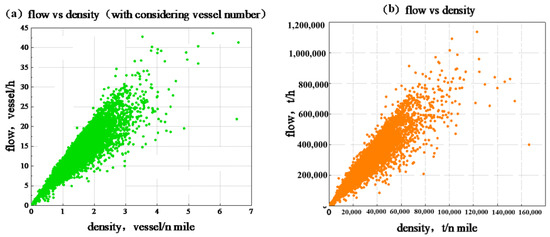 After completing the above steps, Equations (5)–(7) and (16)–(18) can be brought in to calculate values of flow, density, and speed for two scenarios: not considering vessel size and considering vessel size.