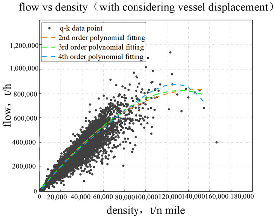 To find out the reason for the difference between the two flow–density subgraphs, after observing the distribution characteristics of scatters in the flow–density subgraph of Figure 11c, this paper uses a polynomial model to fit the scatter data by the least-squares method. Figure 13 shows the results of the second, third, and fourth-order polynomial fittings of the flow–density subgraph for the case of considering vessel size.