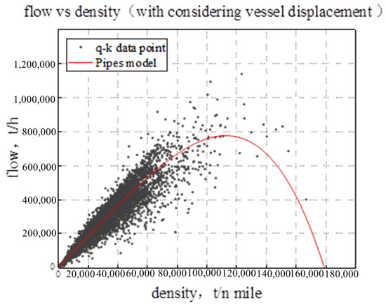 As shown in Figure 15 and Table 5, this paper fits the flow–density subgraph (Figure 11c) using the q–k relationship derived from the Pipes model. The result shows that the Pipes model fits the channel traffic flow–density subgraph (considering vessel displacement) very well, with reaching 0.85. With this model, the obstruction density of the target channel in the south trough waters of Shanghai Harbor can be obtained as 1.79 105 t/n mile.