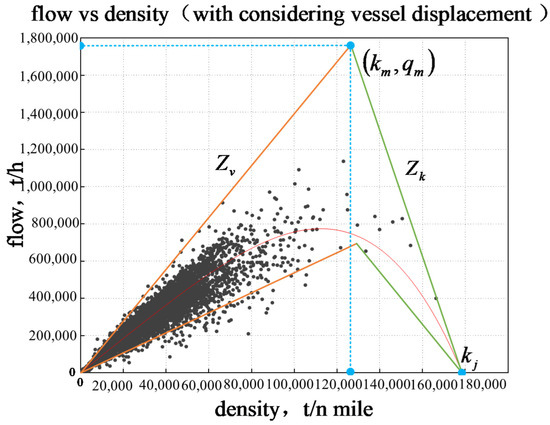 In the flow–density subgraph of the road traffic stream, the optimal density and its corresponding capacity lie from 1/4 to 1/3. The overall scatter in the subgraph shows a trend like a parabola with the apex skewed to the left, with the non-congested zone occupying a smaller area than the congested zone. As shown in Figure 16, the obstruction density is 1.79 105 t/n mile; the optimal density is 124,323 t/n mile, and the value of its corresponding capacity is 1,735,551 t/h, both of which are in the range from 2/3 to 3/4. The area surrounded by the four boundary lines in the figure is overall skewed to the right, with the non-congested zone occupying a larger area than the congested zone. This suggests that the waterway traffic stream operates differently from the road traffic stream, specifically showing symmetry in the flow–density subgraph.