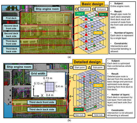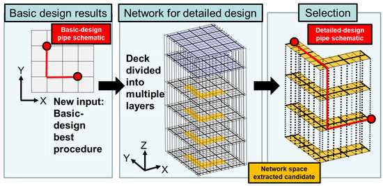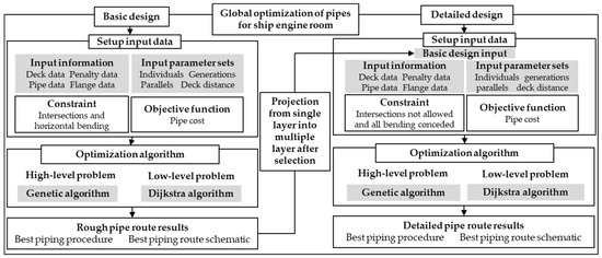 - The optimization of pipe routing comprised two distinct but interconnected design phases: the basic-design phase, which established a preliminary schematic route for the pipes; and the detailed-design phase, which focused on refining this preliminary route to determine a more detailed and precise layout for the pipes.