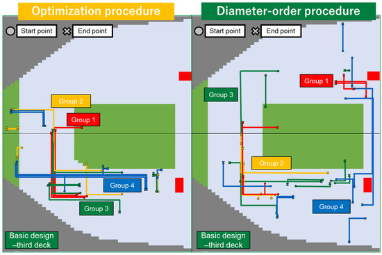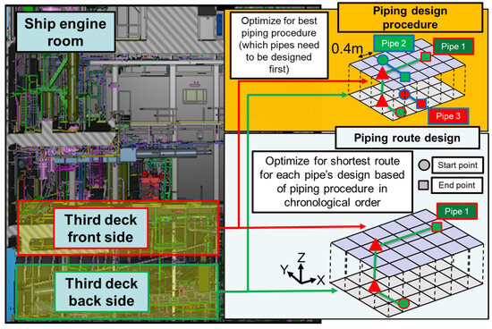 - System Arrangements: After inputting the information and parameters based on the basic design and procedure optimization results, the optimized system worked gradually by arranging pipes from the third deck to the first deck, following the basic-design results, resulting in an optimized detailed route.