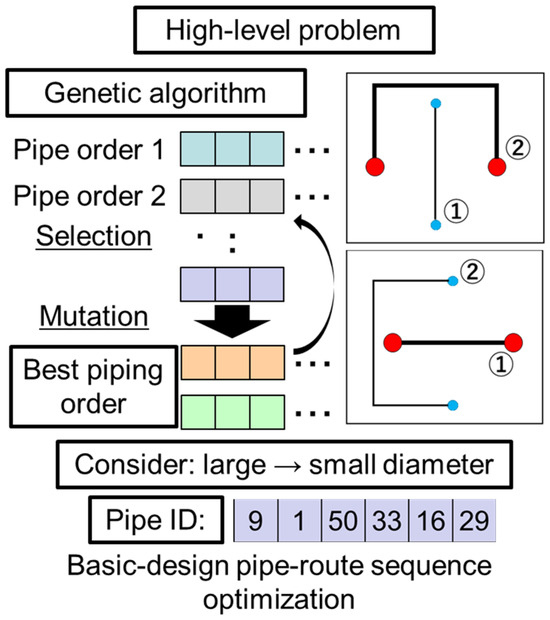 - Ito, T. A genetic algorithm approach to piping route path planning. J. Intell. Manuf. 1999, 10, 103–114. [Google Scholar] [CrossRef]