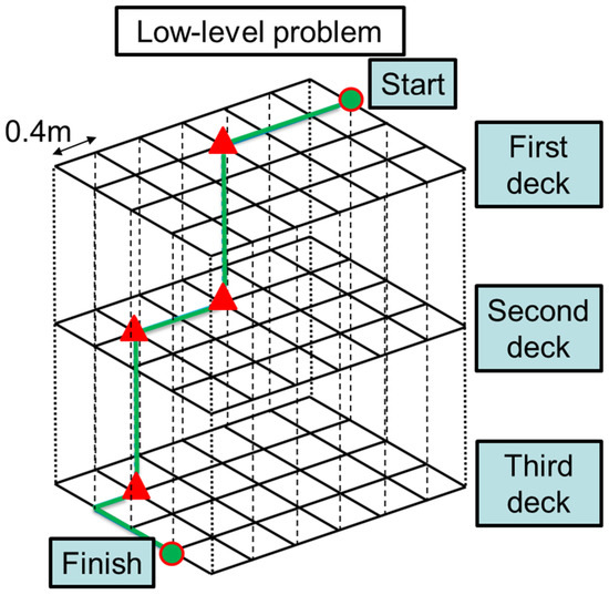 - Deck information: Each deck layer of the target space required specific input. The grid adapted the ship deck floor plan as the space where pipe routing would be conducted, including obstacles and the starting and ending points of each pipe. The grid geometry had sides of 0.4 m.