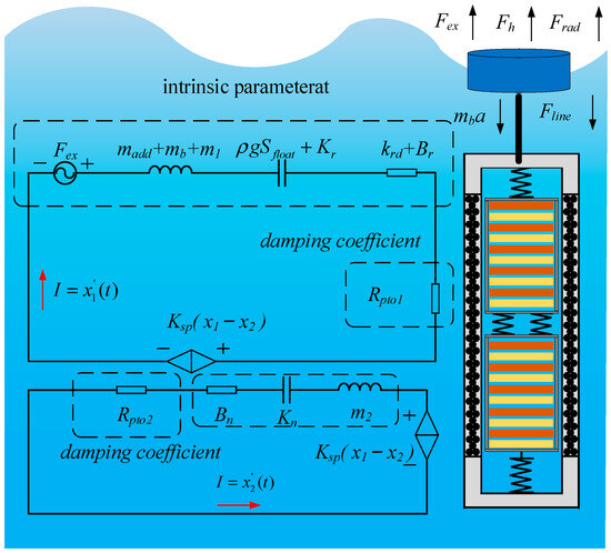 From Equations (4) and (5), considering the upper translator is rigidly connected to the float, x(ω) = x1(ω), x’(ω) = x’1(ω), an equivalent circuit diagram can be obtained as shown in Figure 2, considering madd + mb + m1 and m2 as inductance values, krd + Br and Bn as resistance values, and ρgSfloat + Kr and Kn as capacitance values. These parameters are referred to as the intrinsic parameters of the wave power generator. ksp(x1 − x2) is considered as a controlled voltage source. The velocity of the float is then equivalent to the current in the first circuit of Figure 2, and the velocity of the lower translator is equivalent to the current in the second circuit with a controlled voltage source of Figure 2.