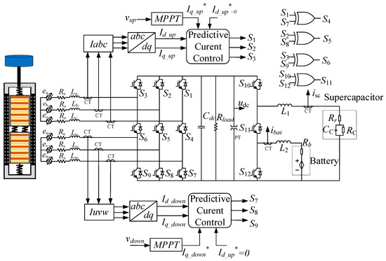 The proposed multiport converter applied to DP-DDWEPGS consists of a nine-switch converter (NSC) and an integrated DC-DC converter, and its topology and control block diagram are shown in Figure 3. NSC is interfaced with a dual-port permanent magnet linear generator (DP-PMLG), functioning as a rectifier. Concurrently, an integrated bidirectional DC-DC converter facilitates the connection between the DC bus and the HESS to maintain power stability on the load side.
