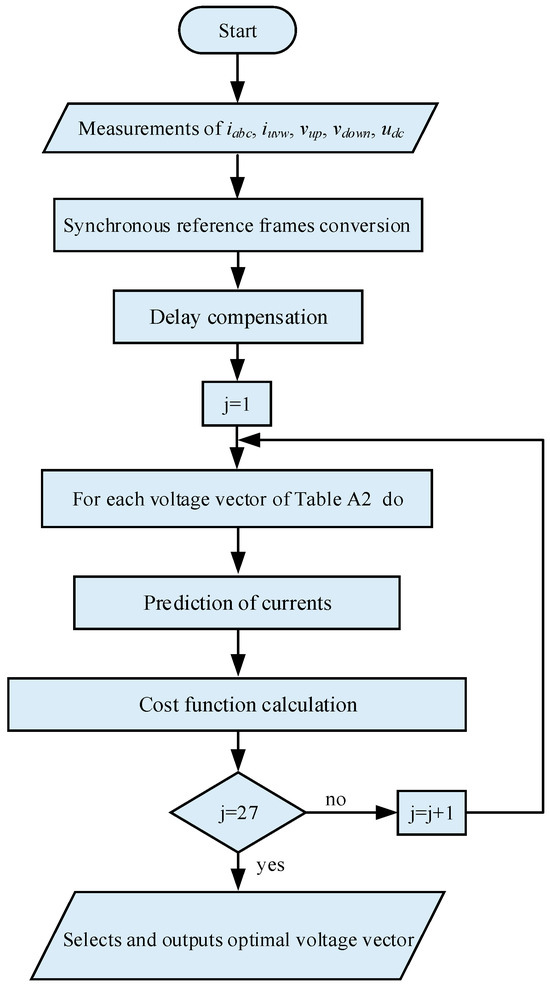 The voltage vector model of the NSC forms the basis for the current model prediction and cost function evaluation steps. In this context, NSC for DP-DDWEPGS, with its 27 voltage vectors, is utilized, as shown in Table A1. The cost function, which encompasses all variables of the dual-port system, is predicted using a conventional current model. We refer to this type of control as MPCC, and its control algorithm is shown in Figure 4.
