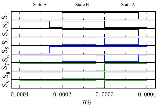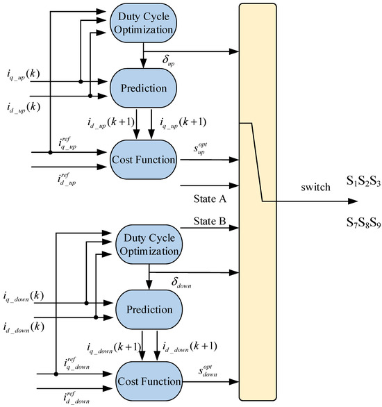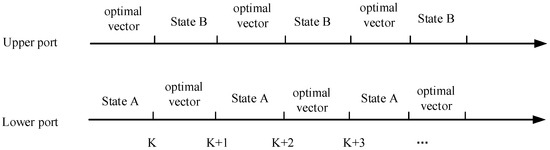 In state A, the upper port three-phase VSR has only eight voltage vectors (V0~V7 shown in Table A1), and in state B, the lower port three-phase VSR also has only eight voltage vectors (V0~V7). Decoupling of the upper and lower port MPCC is achieved when the upper and lower port MPCC are operated alternately, with each MPCC operating at half the discretization time, as shown in Figure 6. At this time, the cost function also realizes decoupling and is divided into two parts corresponding to each port (24).