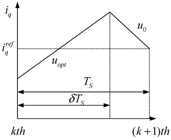 From Figure 7, it can be seen that the optimal voltage vector uopt combined with the zero vector u0 acts in the same control cycle. The predicted value of iq at the moment of (k + 1) is equal to the given value of iq from MPPT. δ is the duty cycle of uopt.