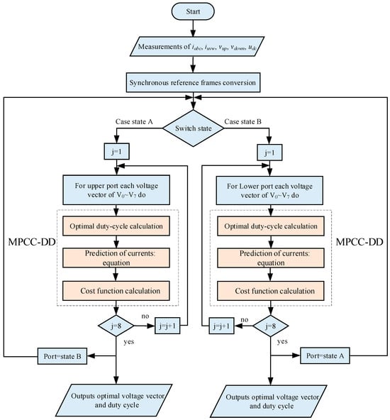 The MPCC of the NSC dual ports is alternated and the duty cycle optimization calculation is added so that the acting voltage vector and zero vector work together to reduce the maximum power point fluctuation. We refer to this type of control as MPCC-DD, and its overall control algorithm is shown in Figure 9.