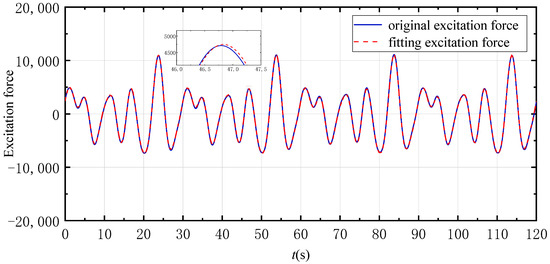 According to the sea conditions along the coast of China, the JONSWAP spectrum with a period T of 6.5 s and a significant wave height Hs of 1.75 m is selected [27]. The excitation force on the float from the irregular waves can be obtained. By performing a fast Fourier transform, five main frequencies of the wave excitation force can be identified, with the decomposed parameters listed in Table 1. It is shown in Figure 10 that the fitting excitation force at the selected five main frequencies basically matches the original excitation force and can be a good substitute for it.