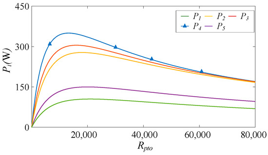 The power corresponding to each of the five frequencies is calculated through Equation (29), as shown in Figure 11. Each of the five frequencies has its respective optimal damping coefficient, where Pi (i = 1, 2, 3, 4, 5) reaches its maximum value. It can be observed that ω4 is the frequency with the maximum power in the excitation force.
