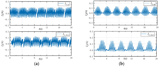 The d/q current of generators under irregular wave excitation. (a) id of upper under irregular wave excitation; (b) id of lower under irregular wave excitation; (c) iq of upper under irregular wave excitation; (d) iq of lower under irregular wave excitation.