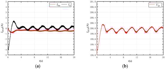As we can see, due to the action of irregular waves, the magnitude and frequency of the translator velocity are constantly changing, and the frequency and magnitude of iq can be found through Equation (15), which also varies with the velocity. The d/q current of the upper and lower power ports can be controlled with a small bias between input and feedback values. This indicates that the proposed controller has the advantages of quick following and good broadband frequency response performance and is suitable for wave power generation systems with variable frequency input power. However, it can be seen that at maximum transient power (about 24 s), the lower d current increases because it is the highest speed and force point, and the angular error also increases. Therefore, to obtain a more perfect performance, instantaneous high speed and force should be considered.