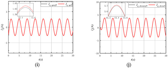 The simulation effect of control of q-axis current under different frequencies. (a) iq of upper power port under frequency f1; (b) iq of lower power port under frequency f1; (c) iq of upper power port under frequency f2; (d) iq of lower power port under frequency f2; (e) iq of upper power port under frequency f3; (f) iq of lower power port under frequency f3; (g) iq of upper power port under frequency f4; (h) iq of lower power port under frequency f4; (i) iq of upper power port under frequency f5; (j) iq of lower power port under frequency f5.