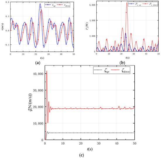 Performance of system under irregular waves. (a) Speed of upper and lower power port; (b) Dynamic power of upper and lower power port; (c) Damping of upper and lower power port.