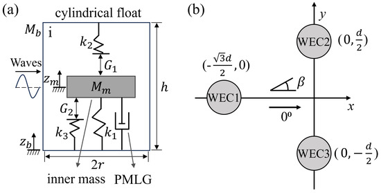 where and are the inner mass of the jth VIWEC in the array and its heave acceleration, respectively. The interaction force is determined by the relative displacement of the inner mass with respect to the float, i.e., , given as