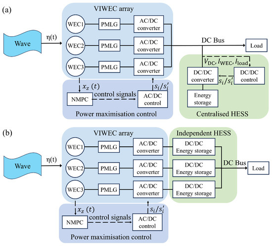 (a) Centralised and (b) independent energy storage for the VIWEC array.