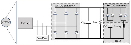 For each VIWEC in the array, an AC/DC converter regulates the three-phase AC electric power generated by the PMLG into DC power. To ensure stable DC voltage for uninterrupted DC loads, two buck-boost DC/DC converters are employed in the hybrid energy storage system (HESS). The electrical components of the VIWEC, including the AC/DC and DC/DC converters, lithium-ion batteries, and supercapacitors, are illustrated in Figure 3. In the VIWEC array, three VIWECs are connected to the load in parallel. In the independent energy storage (IES) configuration, each VIWEC operates with its own HESS, whereas in the centralised energy storage (CES) configuration, the three VIWECs share a single central HESS.
