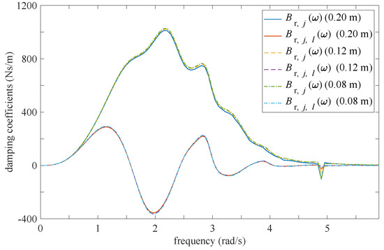 The results of ANSYS/AQWA for three different mesh sizes are compared. The mesh sizes are 0.20 m, 0.12 m, and 0.08 m, corresponding to element counts of 1620, 4333, and 9771, respectively. The radiation damping coefficients, as illustrated in Figure 6, show very little variation across the different mesh sizes. The added masses at infinite frequency for each VIWEC are 1902, 1893, and 1891 kg, respectively, for the three mesh sizes. Taking into account the balance between computational efficiency and accuracy, the 0.12 m mesh size is selected here.