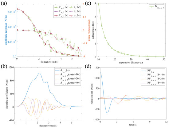 (a) Amplitude and phase response of excitation force at , (b) radiation damping coefficients, (c) added mass at infinite frequency and (d) radiation IRF.