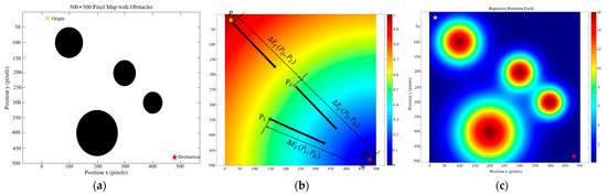 - The size of the potential energy field is not fixed, but can be dynamically adjusted according to the kinematic characteristics of the AUV (e.g., parameters such as velocity and acceleration). This dynamic adjustment allows the potential energy field to adapt to instantaneous changes in the environment, enabling the AUV to maintain efficient and safe navigation when in different undersea environments.