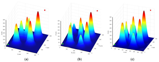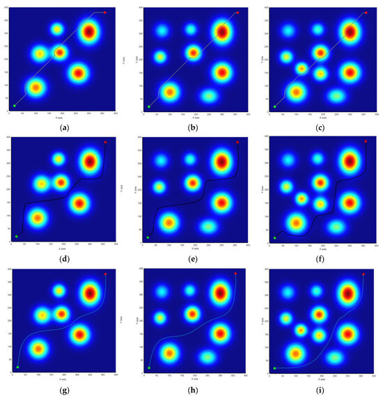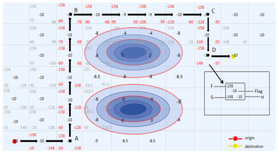 - The G-value and H-value are redefined. Compared to the traditional algorithm that uses distance as a criterion to evaluate the cost of a path, the FT-A* algorithm uses the weighted value of the potential energy value and distance as the new criterion, which takes into account the kinematic characteristics of the AUV itself as well as the threat cost of the obstacles, and helps to avoid planning a path that passes through the high-risk areas directly even though they may be the shortest possible paths.