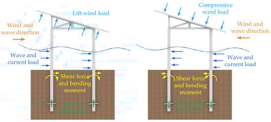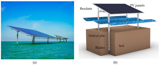 Offshore PV foundations are generally classified into two main types: floating and fixed. Floating structures are designed to allow PV panels to float on the water’s surface. These platforms are anchored to the seabed to prevent drift but are otherwise free to move with waves, which reduces stresses on the panels and the structure [5]. Fixed structures, as shown in Figure 1, are anchored directly to the seabed. These foundation structures are usually made from steel or concrete and are suitable for shallow waters where the seabed is accessible for construction.