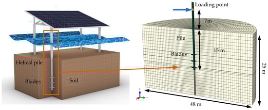 The offshore PV foundation consists of an upper PV bracket and four helical piles. Due to the large span of the PV bracket, every two helical piles are spaced relatively far apart, typically more than 20 times the pile shaft’s diameter, allowing the group pile effect to be ignored [21]. Therefore, for an in-depth study of the helical piles’ bearing performance under horizontal cyclic loadings, a single helical pile is chosen for the analysis. The helical pile’s diameter d is set to 0.8 m according to practical offshore PV engineering experience in Shandong Province, China (Figure 1), with the appropriate range of pile diameters (0.6–0.8 m) for offshore PV foundations. The blade diameter D is set to three times the pile’s diameter of 2.4 m. The helical pile and blades’ thickness is 3 cm, and the pitch is set to 0.3d = 0.24 m. According to the research by Merifield [22], increasing the number of blades can enhance the bearing performance to some extent, but having more than three blades increases construction difficulty. Thus, the number of blades is set to 3, with a spacing l of 2.4 m between the blades. The pile length L is 25 m, with 10 m above the seabed and 15 m embedded in the soil, and the first blade is buried at a depth of 9.2 m. The material for the helical pile and blades is steel, with a material density of 7850 kg/m3, an elastic modulus of 210 GPa, and a Poisson’s ratio of 0.3. To eliminate boundary effects, the soil region is set to a diameter of 20D = 48 m, with a height of 1.67 times the pile’s embedded depth of 25 m. The soil’s undrained shear strength Su at the mud surface is 13 kPa and increases linearly with depth, Su = 13 + 2z kPa (z is the soil depth). The saturated unit weight is 16.95 kN/m3, and the Poisson’s ratio is 0.45. Abaqus 2022 software is used to establish a 3D FEM of the helical pile and soil (Figure 3), which are modeled as three-dimensional solid elements, with the mesh type being C3D8. Soil domain size and mesh sensitivity analysis were carried out to investigate the boundary and mesh density effects. A soil size with a radius of 48 m and a mesh density of 58,208 elements is considered sufficient to avoid boundary and mesh density effects. A frictional contact algorithm featuring a contact friction coefficient of 0.3 is employed to model the interaction between the helical pile and soil. Normal contact is set to “hard contact”, allowing separation after contact. The boundary conditions impose restrictions on both horizontal and lateral displacements at the base of the soil region, with horizontal displacement constraints also applied to the sidewalls. An initial geostatic analysis is performed before applying horizontal loads to establish the soil’s initial stress fields. In addition, a simplification is made in this numerical model. Due to the irregular shape of the helical blades, if they are modeled as helical in the FEM, the qualities of the mesh elements near the blades are typically poor, leading to non-convergence or significant errors in the results. When the pitch is between 0.2d and 0.3d, the helical blades can usually be simplified as flat blades, and the bearing capacities of the simplified piles are almost the same as those of prototype ones [20,23,24].