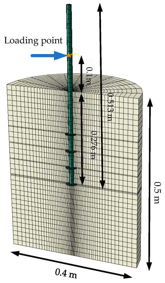 The tests conducted by Prasad [28] under horizontal loading were selected for simulation to verify the numerical analysis methods for the performance of helical piles in clay under horizontal cyclic loadings and the effectiveness of the constitutive model of the soil. The experiment consists of tests for both monotonic loadings and horizontal cyclic loadings. The length of the helical pile is 513 mm, the diameter is 13.8 mm, and it consists of four blades. The blade diameter is 30 mm, and the spacing between the blades is 49.7 mm. The helical pile was embedded with a depth of 276 mm. The clay soil has a saturated unit weight of 16.95 kN/m3 and an undrained shear strength of 10.0 kPa. The tests were carried out in a cylindrical container measuring 400 mm in diameter and 500 mm in height. The loading point was located 100 mm above the mud surface. A corresponding 3D FEM was established, as shown in Figure 5.