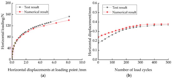 Comparisons of simulation results with test results: (a) Load–displacement curves under monotonic loading; (b) Cycle number-displacement curves under horizontal cyclic loading.