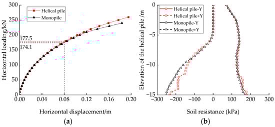 To examine the ultimate horizontal bearing performances of a single helical pile under horizontal loading, as described in Section 2.1, a corresponding monopile without blades is also established for comparison. The monopile model’s diameter, wall thickness, and soil parameters are the same. A monotonically increasing horizontal load along the positive Y direction is applied at the 7.0 m height above the mud surface (representing the combined loading point of the wind and wave forces) until the ultimate horizontal bearing limit is reached with a load increment of 10 kN at each step.