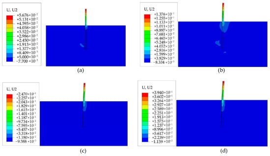 Horizontal displacements after 200 cycles with different vertical loads: (a) Helical pile 25, kN; (b) Helical pile, −25 kN; (c) Monopile, 25 kN; and (d) Monopile, −25 kN, respectively.