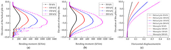 Distribution of bending moments with height for (a) helical pile and (b) monopile under different horizontal load amplitudes, and (c) horizontal displacements along the piles’ shaft.