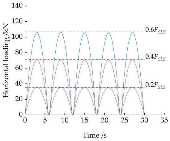 To study the effects of cyclic loadings amplitude on horizontal bearing performances of the piles, semi-sinusoidal horizontal cyclic loadings with amplitudes of 0.2 FSLS, 0.4 FSLS, and 0.6 FSLS, and a period of 6 s are applied at the loading point mentioned earlier. The time history curves of the applied horizontal cyclic loadings for the first five cycles are illustrated in Figure 11.