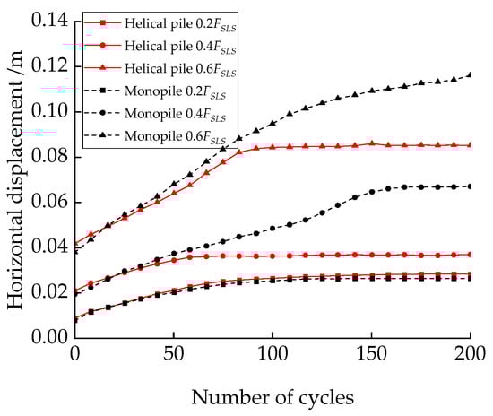 - Under small horizontal cyclic loadings, the stiffness of the soil around piles stabilizes after a certain number of cycles, and the horizontal displacement no longer increases. Under larger cyclic loads, the stiffness of the soil degrades significantly, leading to more significant accumulated plastic deformation. The horizontal bearing capacity of the helical pile under cyclic loading is approximately 60% of its capacity under monotonic loading, whereas the monopile’s capacity under cyclic loading is less than 60% of its monotonic loading capacity.
