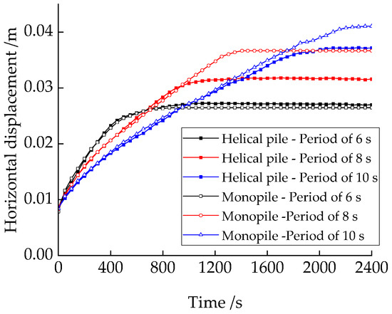 Time history of horizontal displacement of the helical pile and monopile at mud surface under different load periods.