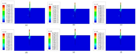 Horizontal displacements after 100 cycles with different load periods: (a) Helical pile, 6 s; (b) Helical pile, 8 s; (c) Helical pile, 10 s; (d) Monopile, 6 s; (e) Monopile, 8 s; and (f) Monopile, 10 s, respectively.