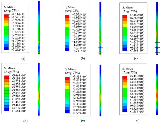 Von Mises stress of the piles after 100 cycles with different load amplitudes: (a) Helical pile, 0.2FSLS; (b) Helical pile, 0.4FSLS; (c) Helical pile, 0.6FSLS; (d) Monopile, 0.2FSLS; (e) Monopile, 0.4FSLS; and (f) Monopile, 0.6FSLS, respectively.