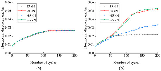 - The shorter the cyclic loading period, the greater the initial horizontal displacement accumulation, and the sooner stability is reached. Conversely, the longer the cyclic loading period, the smaller the initial horizontal displacement accumulation, but the accumulated displacement at stabilization is more significant.
