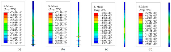 Von Mises stress of the piles after 200 cycles with different vertical loads: (a) Helical pile, 25 kN; (b) Helical pile, −25 kN; (c) Monopile, 25 kN; and (d) Monopile, −25 kN, respectively.