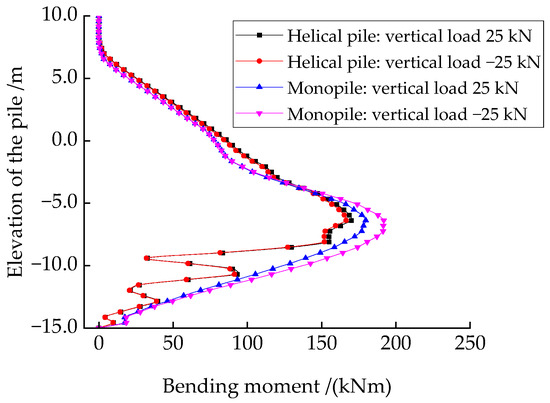 Figure 24 shows the bending moment distribution along the piles’ shafts after 200 cycles under different vertical loads. In the soil layer above −5 m, the bending moments of the helical pile are greater than that of the monopile, validating the earlier hypothesis that in the monopile, the shallow soil stiffness degrades significantly, causing the load-bearing soil layer to move downward. For the monopile, the bending moments rapidly increase to a peak after −5 m and then decrease. The bending moments in the lower section of the helical pile are lower than those in the monopile due to the presence of blades.
