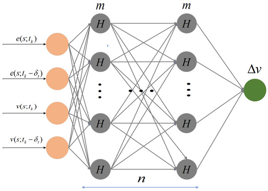 Figure 3 shows the structure of the DNN as the outer-loop controller. From the diagram, it can be seen that there are 20 control inputs. These 20 inputs consist of four 5 × 1 column vectors, including velocity at the previous sampling instant v ( s , t k Δ t ) , position deviation at the previous time instant e ( s , t k Δ t ) , current position deviation e ( s , t k ) , and current velocity v ( s , t k ) , where t k is the current sampling instant and Δ t is the sampling interval. The output layer consists of five nodes, representing the velocity increment Δ v .