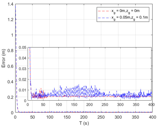 Figure 27. Comparison of 3D trajectory tracking errors of the DNN + ENMPC strategy under having the center of mass shift and without the center of mass shift conditions.