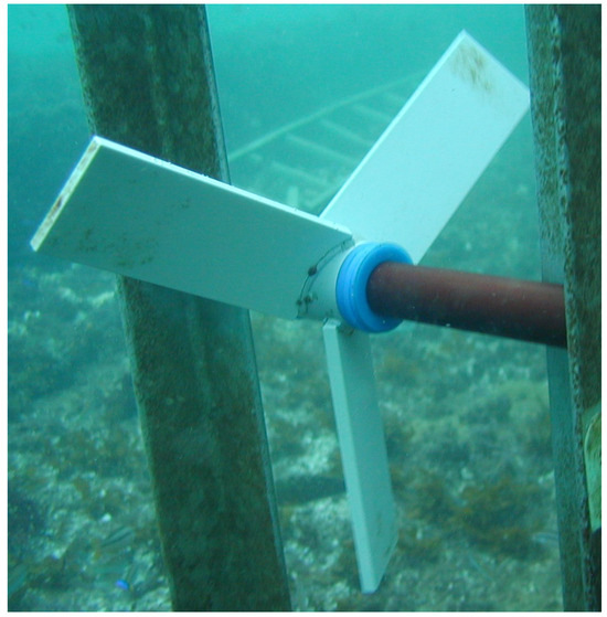 Professor Yusaku Kyojuka from the Faculty of Engineering Sciences at Kyushu University in Japan designed a structure equipped with four turbines, each containing three blades spaced at 60 degrees to the axis of rotation, as shown in Figure 2 and Figure 3. The structure was submerged on the seafloor next to the pier of Ikitsuki Bridge in Nagasaki, Hirado, and Kasugacho, Japan, at a depth of 7 m. The monitoring of biofouling attachment was carried out by a camera over 8 months, from August 2012 to April 2013 [38].