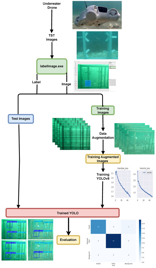 In recent years, machine learning algorithms have shown significant promise in automating the detection and classification of various underwater phenomena, including biofouling [6]. Among these, the YOLO (You Only Look Once) algorithm has gained widespread popularity due to its ability to perform real-time object detection with high accuracy and efficiency [7,8,9]. YOLO’s architecture allows it to process images in a single pass, which is particularly advantageous for monitoring dynamic underwater environments where conditions can change rapidly. By leveraging YOLO and similar machine learning techniques, it becomes possible to create robust biofouling detection systems that not only enhance the accuracy of monitoring efforts but also facilitate proactive maintenance interventions, ultimately improving the operational efficiency of TSTs.
