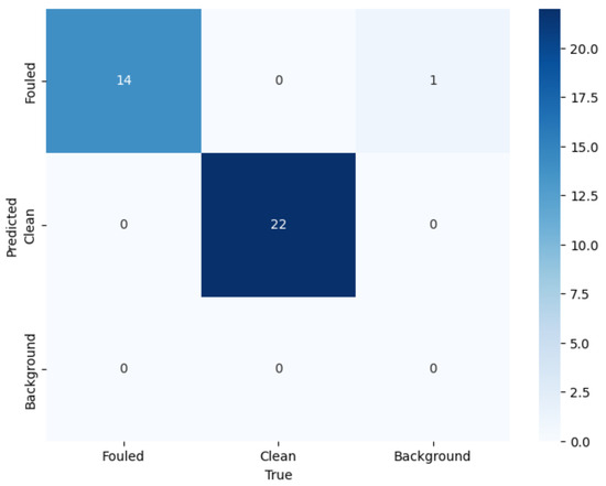 As anticipated, YOLOv8 emerges as the most effective model, demonstrating superior overall results in terms of precision, recall, mAP50, and mAP50-95, as shown in Table 3. YOLOv8 achieves nearly perfect precision for both the “Fouled” and “Clean” classes and maintains a high recall rate, reflecting its excellent overall performance. YOLOv3 performs well but falls short compared to YOLOv8, while YOLOv5 shows significantly lower scores across these metrics. Notably, YOLOv5 fails to detect any “Fouled” cases, as evidenced by zero true positives for this class, highlighting major limitations in its detection capabilities. In contrast, YOLOv3 does manage some detections, although its performance in this respect remains inferior to that of YOLOv8.